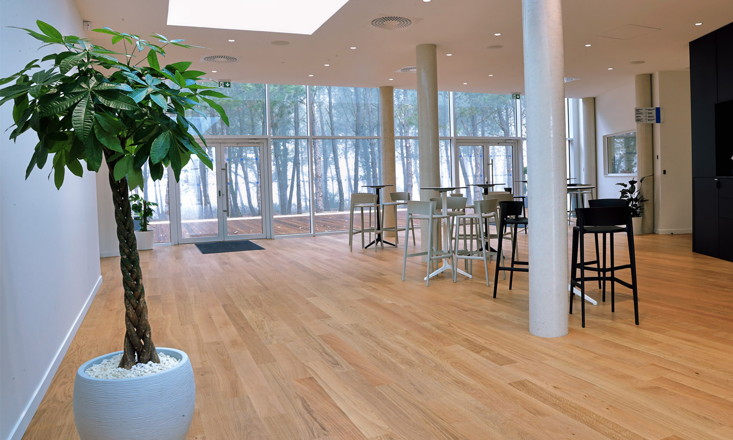 Le hall d’accueil, autour duquel s’articule l’ensemble des volumes, est en position centrale et permet une traversée physique et visuelle du bâtiment. Implanté dans la continuité de l’allée d’arbres et du cheminement faisant jonction entre le projet et les bâtiments existant sur site, il est traité comme une rue intérieure complétement vitrée à chacune de ses extrémités, donnant d’un côté sur le parvis du bâtiment, et de l’autre sur la forêt de pins.