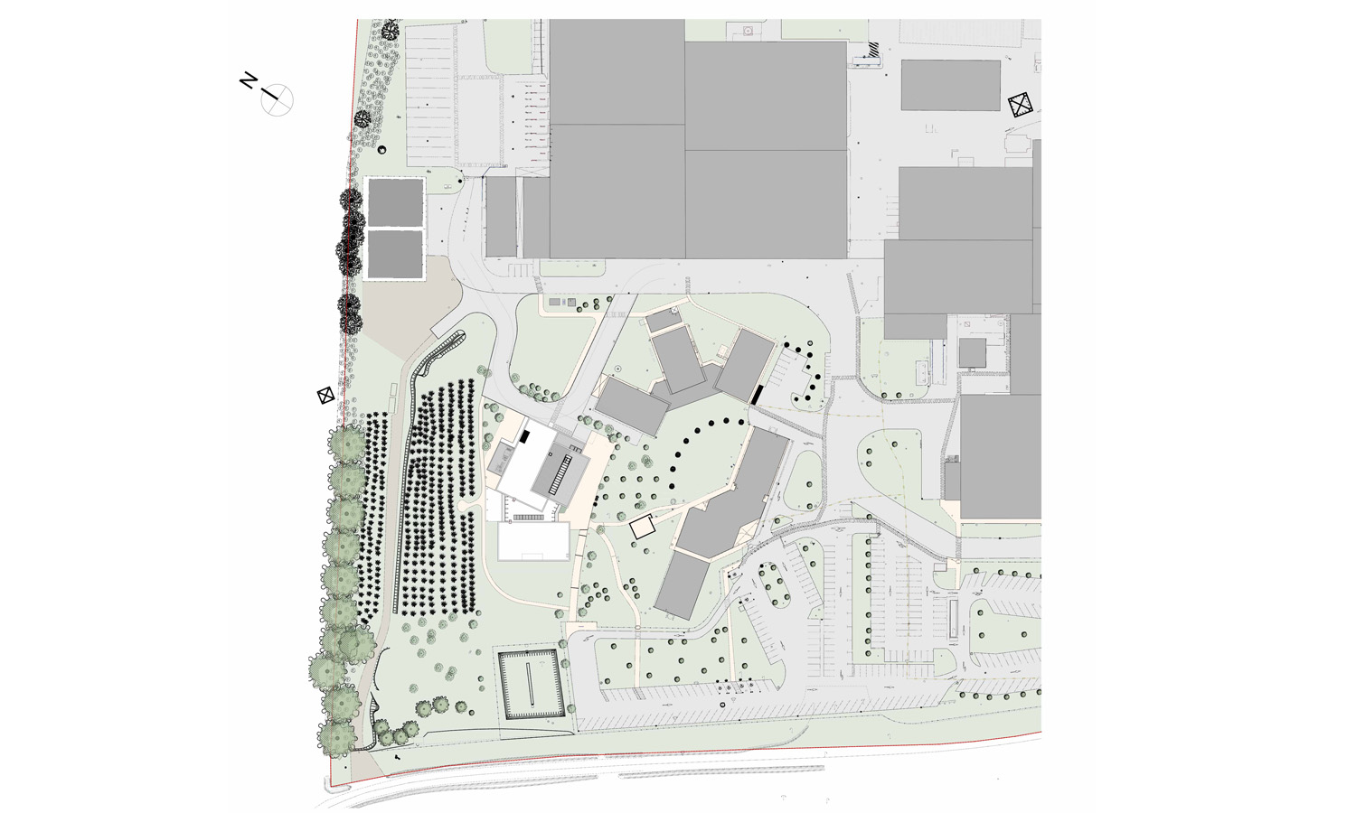 – Le volume de l’administration et la salle de conférence fait face à l’entrée sécurisée propre au centre de recherche. Le cheminement piéton le longe pour mener au parvis et à l’entrée principale.