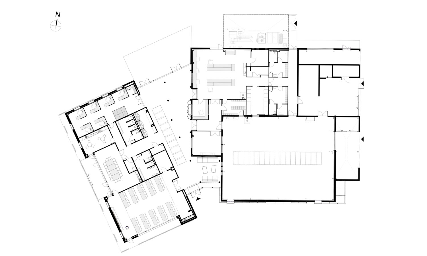 Le parti pris architectural est de faire ressortir ces éléments programmatiques dans la lecture du bâti : le bâtiment suit la même logique en articulant trois volumes différents autour d’un hall imaginé comme une continuité du cheminement extérieur, celui-ci menant au bâtiment depuis les locaux déjà existant sur site.