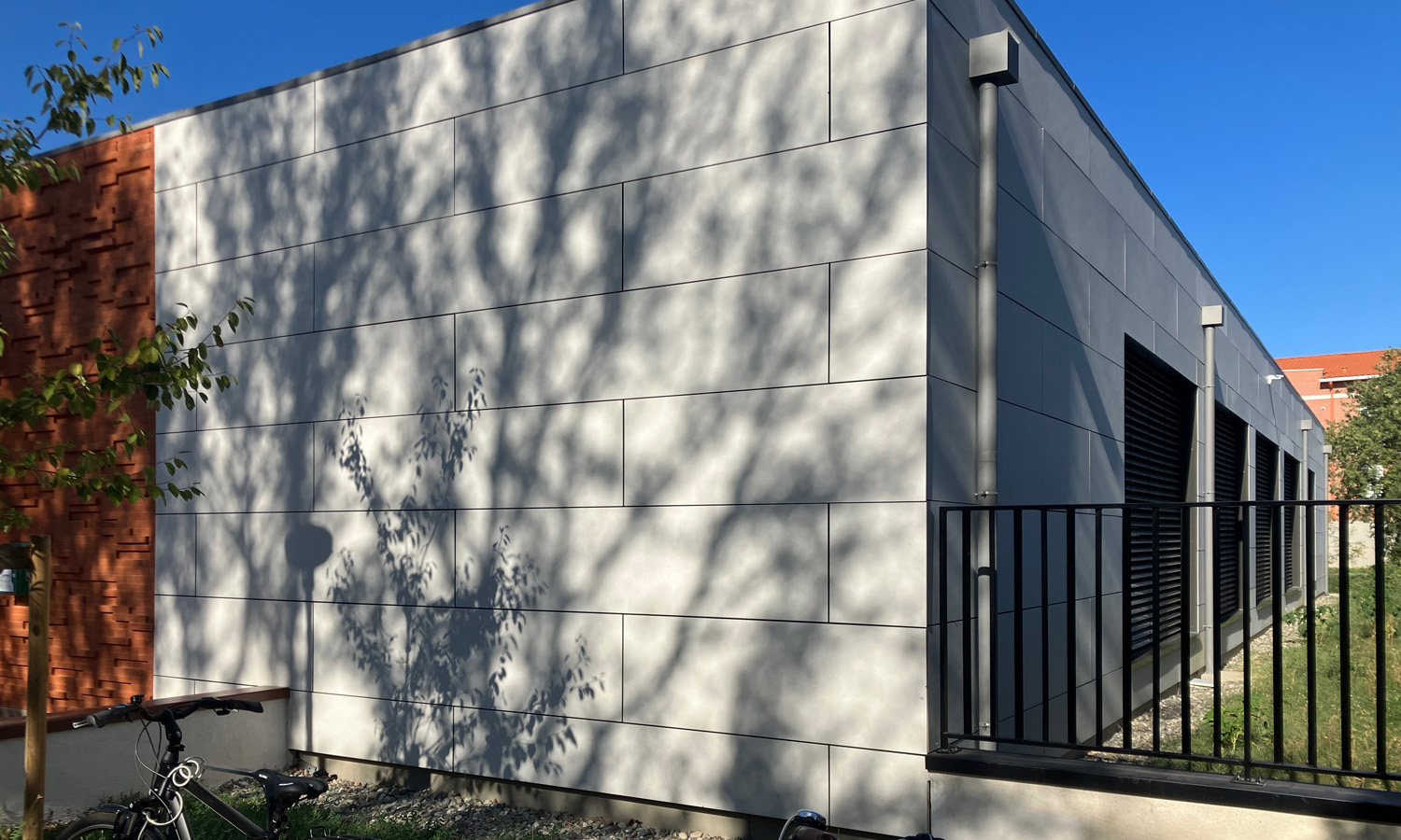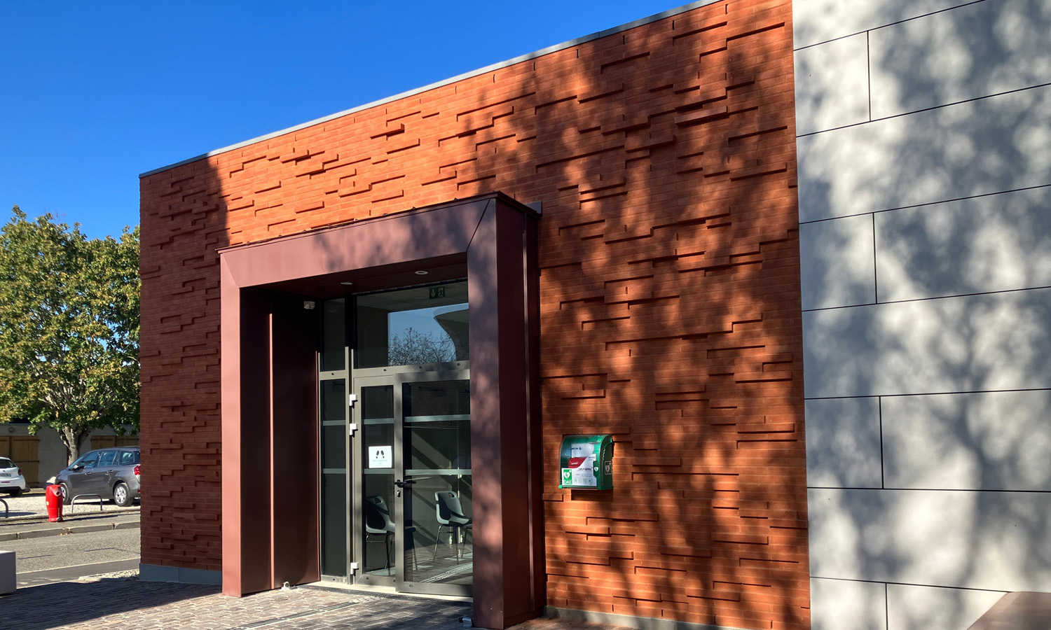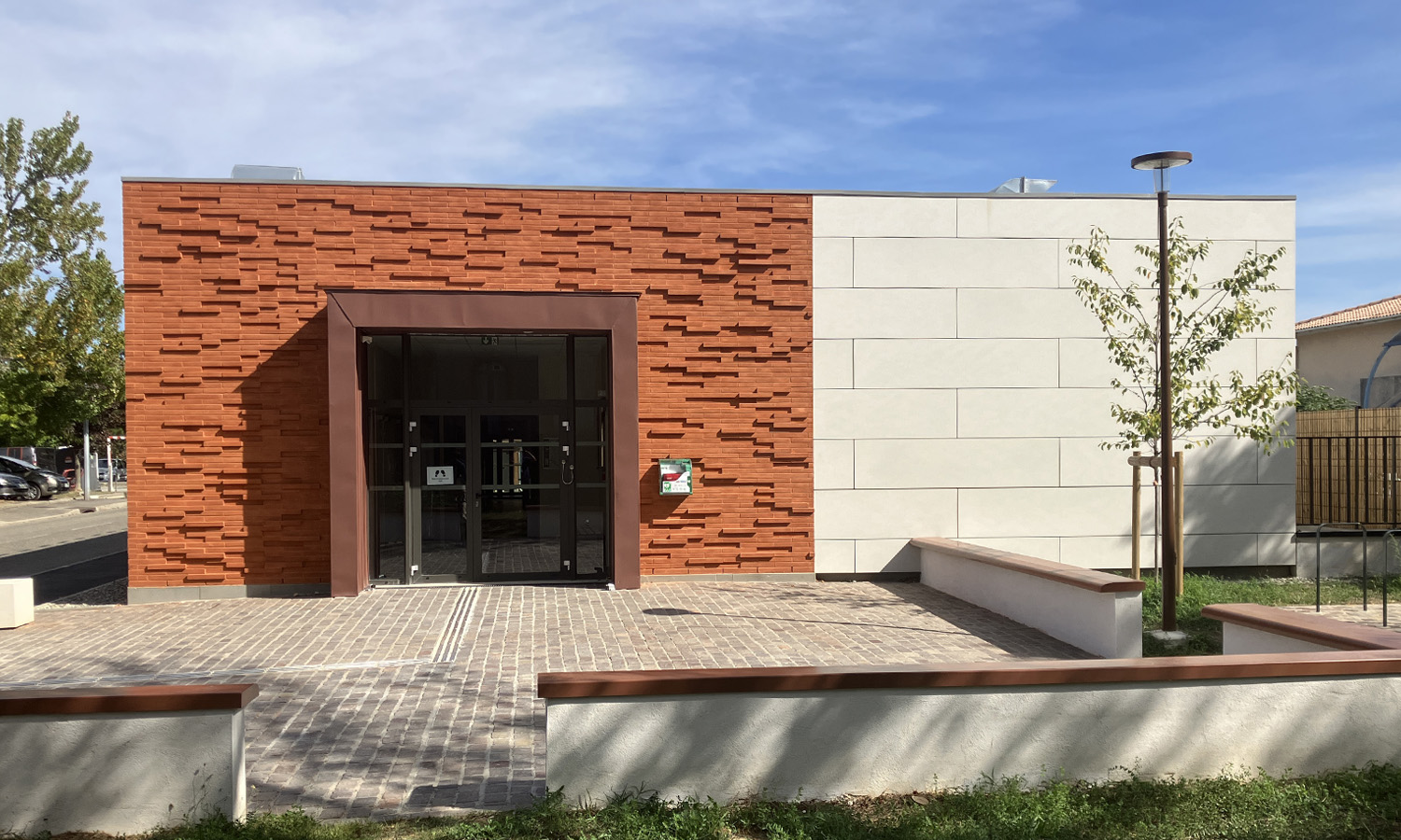 Le calepinage de débord et de retrait de quelques centimètres de certaines briques lui confère un dynamisme lié au jeu d’ombre et de lumière qui créé un relief sur la façade. Une arche en zinc vient affirmer l’entrée principale. Cette volumétrie, résolument simple et longiligne, permet une parfaite intégration de cet édifice public dans un tissu urbain de faible densité.