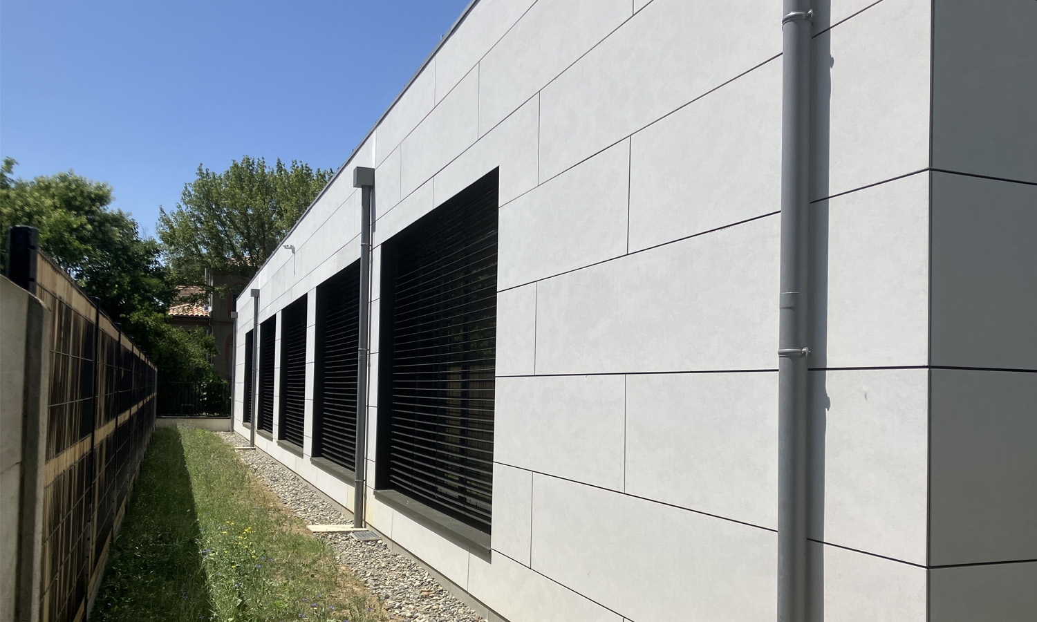 De larges baies vitrées permettent d’éclairer ces espaces. Elles sont équipées de brises soleil orientables qui offrent la possibilité d’adapter la luminosité intérieure et réguler l’apport solaire. Sur la façade côté rue une vêture en zinc naturel déclinée en deux teintes avec des angles à 30° lui donne un mouvement ondulatoire.