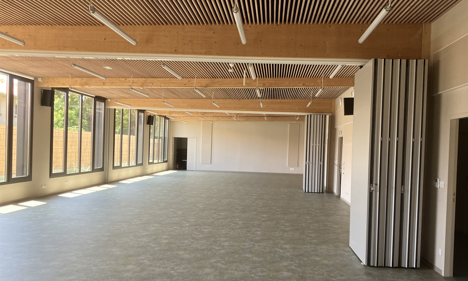 Insérer dans une parcelle cadastrale en lanière, le bâtiment s’étire en bordure de la rue Jean Jaurès. A la jonction entre l’ancien presbytère et le nouveau foyer municipal nous avons créé un parvis d’accueil qui est pavé et agrémenté d’espaces verts. Dans ce bâtiment tout en long, un large espace d’activité est divisible par des cloisons mobiles acoustiques et aménageable en fonction des animations.