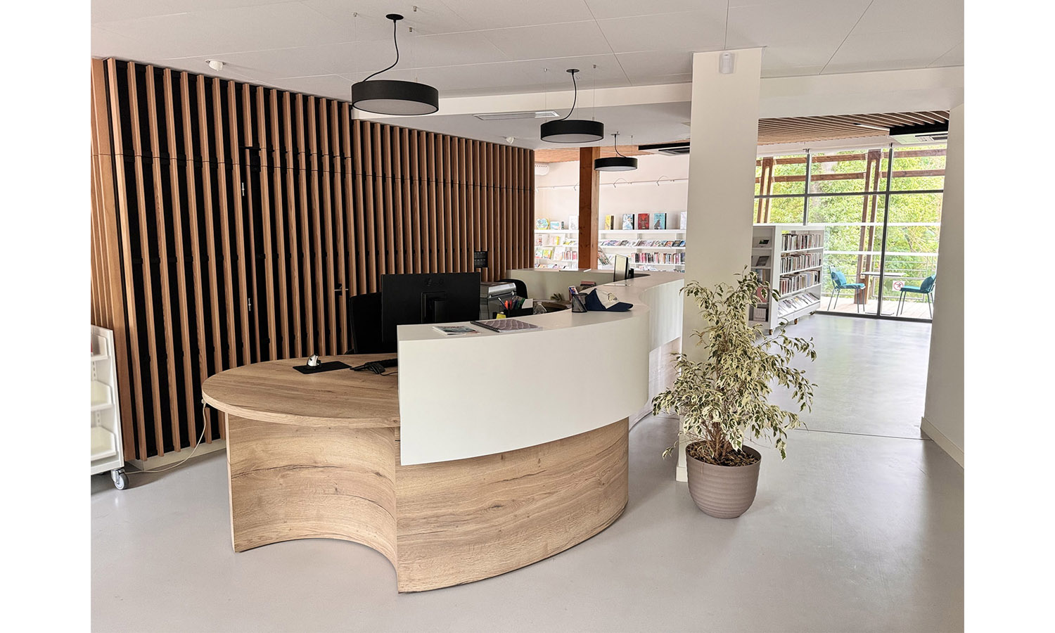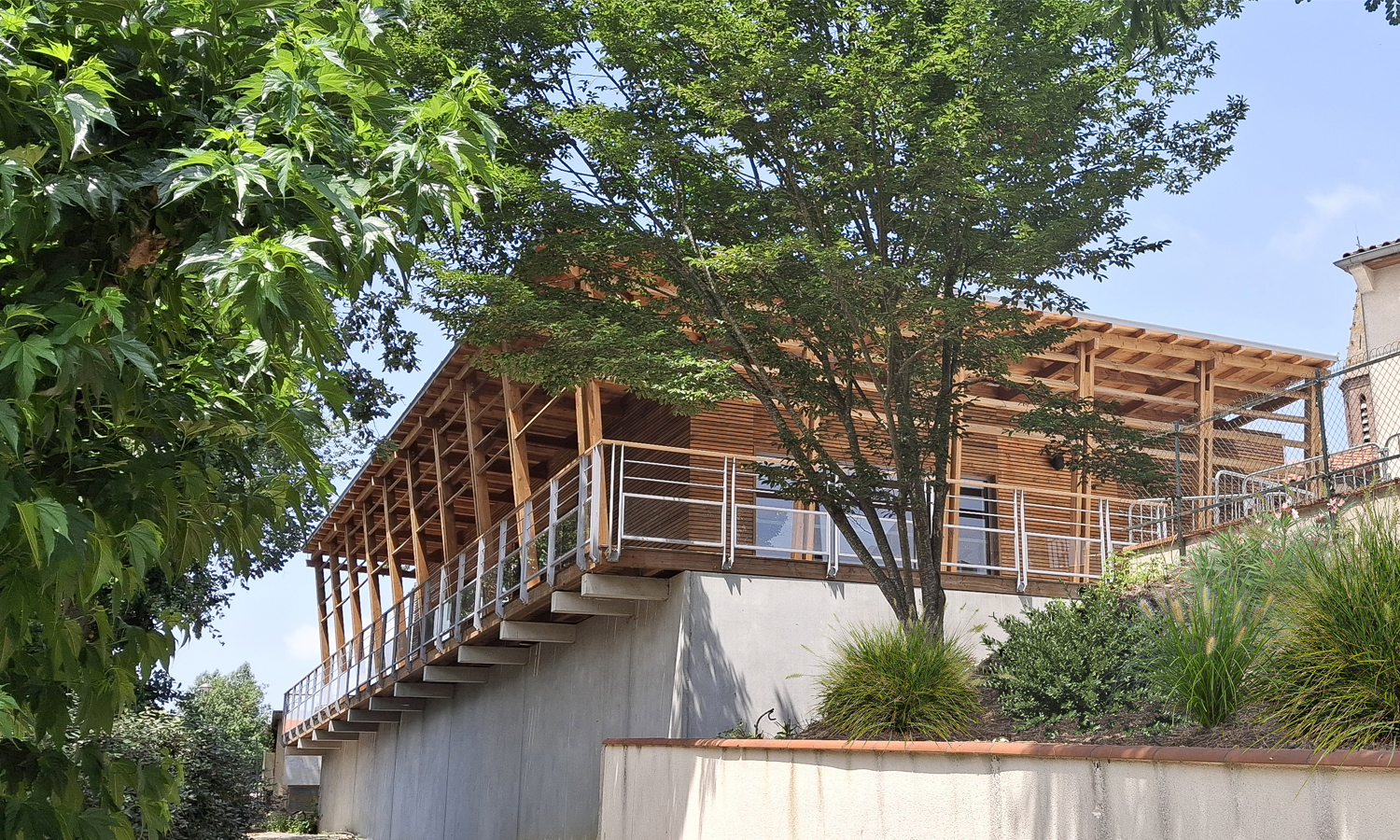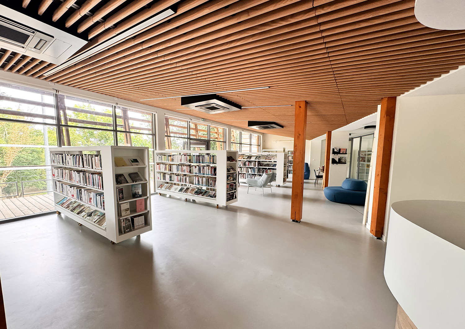 Une vaste terrasse extérieure couverte est créée, afin de proposer un véritable espace de lecture et de convivialité en continuité des espaces intérieurs de la médiathèque, et offrant un promontoire sur le parc boisé.
