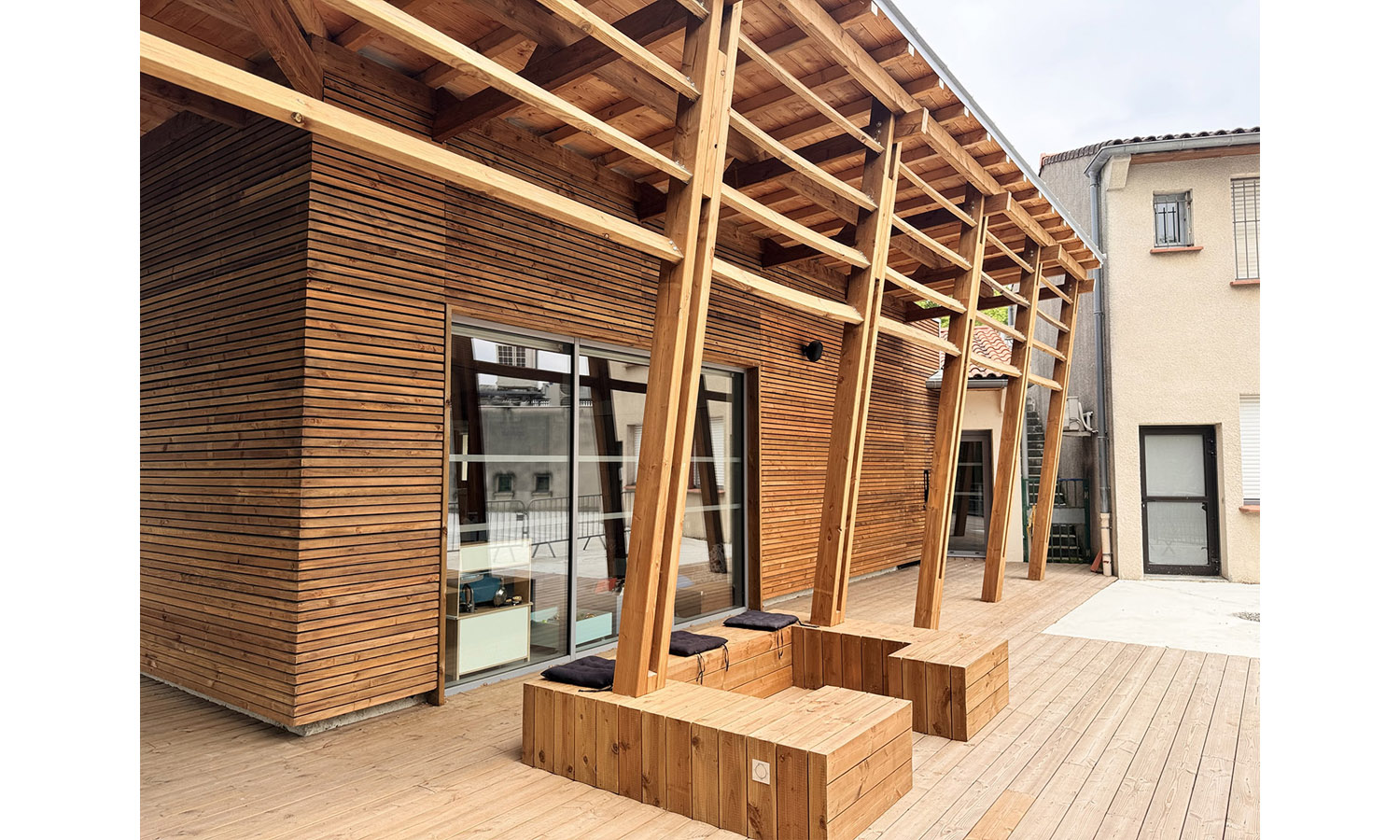 La matérialité de l’extension se veut être l’illustration d’une démarche environnementale affirmée avec l’utilisation de matériaux bio-sourcés comme le bois.