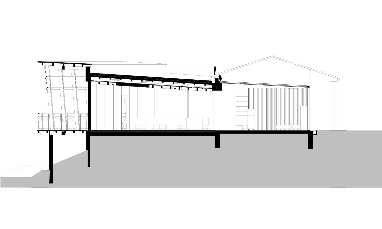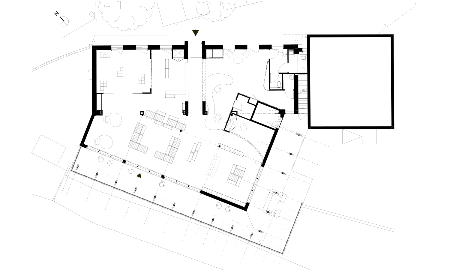 Seule la façade sud est « ouverte » afin de pouvoir créer une extension sur l’arrière du bâtiment. Cette extension surplombe un chemin piétonnier public, traversant la parcelle en contrebas du bâtiment.